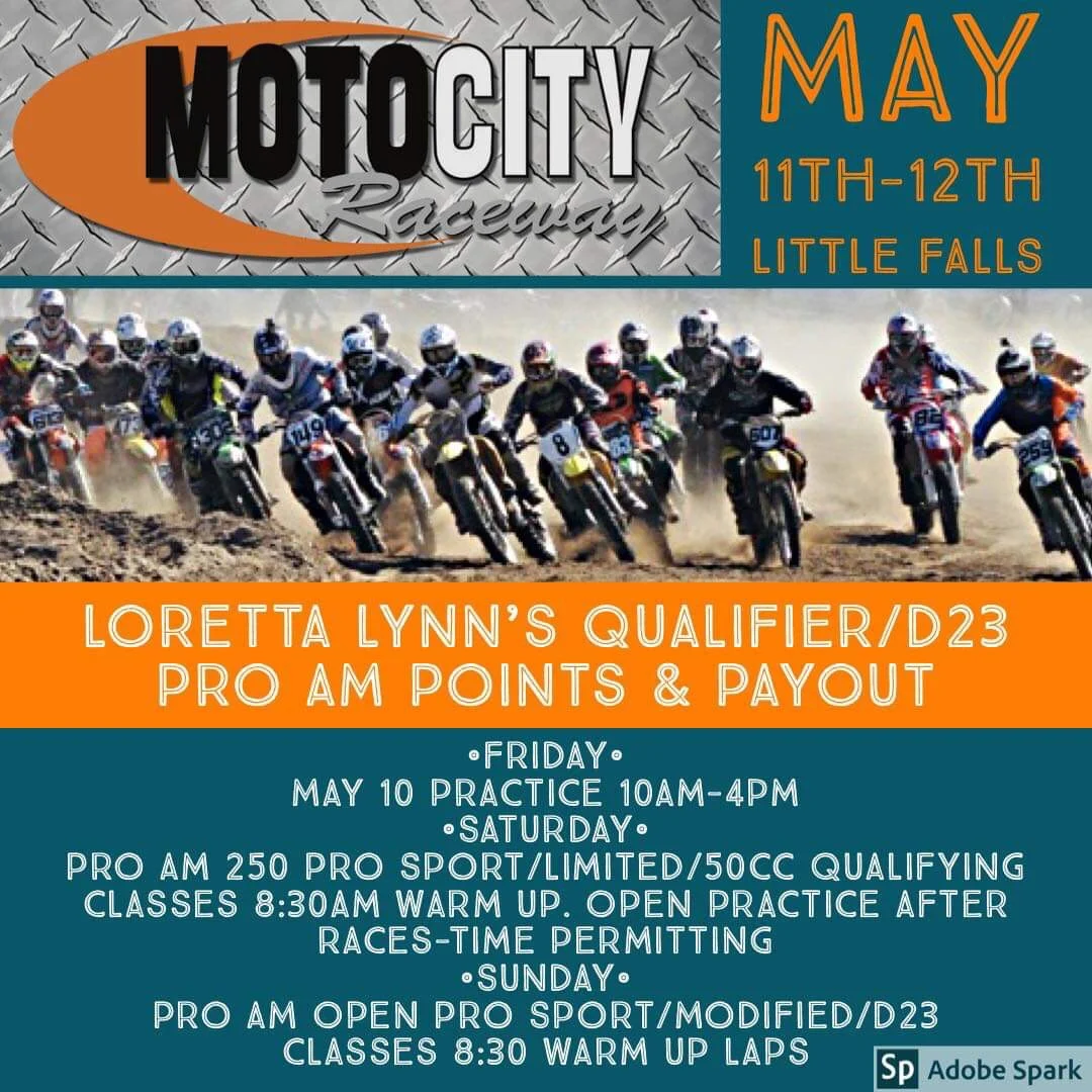 Jessica Noaeill May 6, 2019 Moto City Raceway LITTLE FALLS: Loretta Lynn's Qualifier/D23 Pro Am Points & Payout 5/11-5/12 Jessica Noaeill May 6, 2019 Learn more