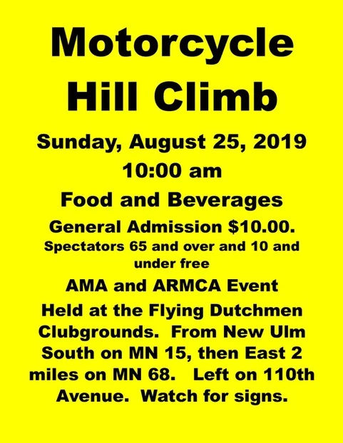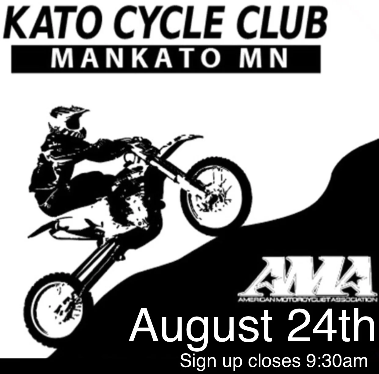 Last chance to Hillclimb at the Kato Cycle Club in 2019. Gates open at 7am sign up closes at 9:30 with first rider going up at 10am! Kato Cycle Club is located 7 miles south of Mankato on state highway 169. Concessions available on site. Admission 10$ kids 12-under and seniors 65+ are free!